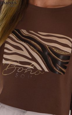 Stílusos és kényelmes választás a hétköznapokra! Ez a barna árnyalatú felső modern mintás elülső díszítésével igazán trendi megjelenést biztosít. A laza szabás és a félhosszú ujj nőies, mégis komfortos viseletet nyújt, így tökéletes választás farmerhez, szövetnadrághoz vagy akár elegánsabb összeállításhoz is.