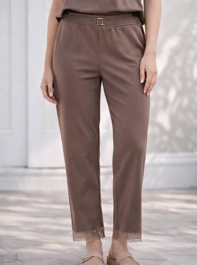Stílusos női nadrág, amely a minimalista eleganciát finom, nőies részletekkel egészíti ki. A letisztult szabás és a rugalmas anyag tökéletes illeszkedést biztosít, míg az alsó részen megjelenő csipke és az arany csatos derékrész különleges megjelenést ad.