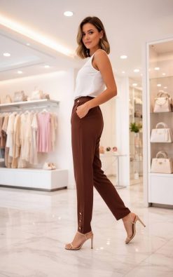 Stílusos, barna női nadrág, amely a kényelmes viseletet különleges részletekkel ötvözi. A magasított, gumírozott derékrész biztos illeszkedést nyújt, míg az egyenes szár és a letisztult szabás elegáns megjelenést kölcsönöz.