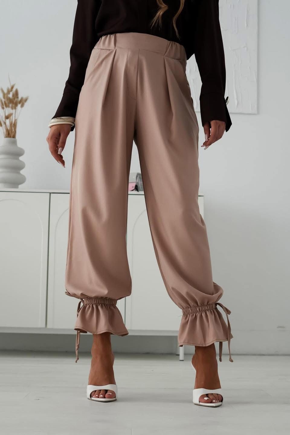 Letisztult vonalvezetés és modern nőiesség találkozik ebben a különleges szabású nadrágban. A magasított derékrész és a lágy esésű fazon elegáns, mégis kényelmes megjelenést biztosít. A húzott, fodros alj játékos és stílusos részlet, amely egyedivé teszi az összhatást, miközben finoman kiemeli a bokát.
