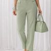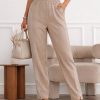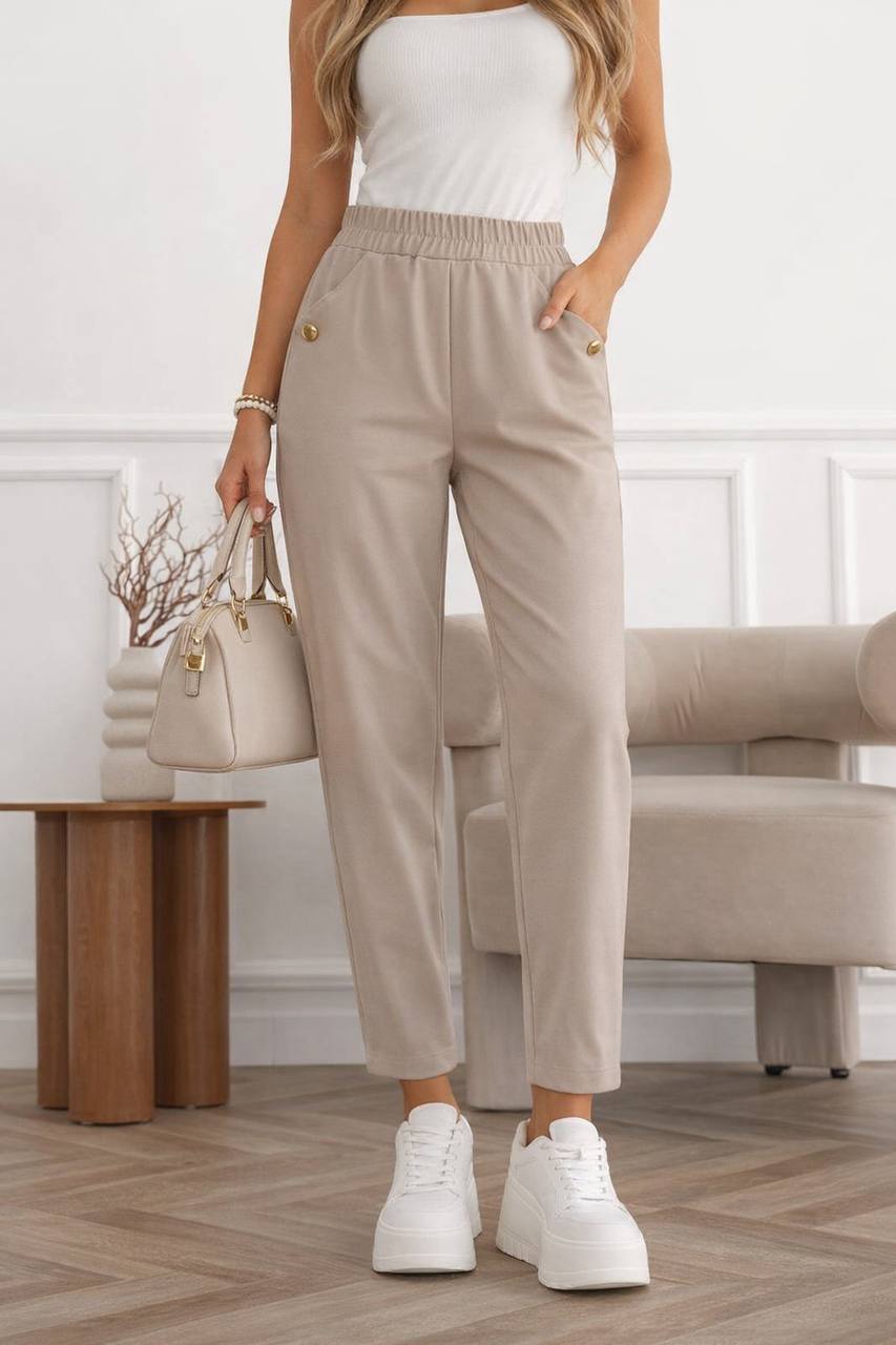 Ez a bézs női nadrág tökéletes választás, ha a kényelmet letisztult, nőies stílussal szeretnéd ötvözni. A gumis derékrész egész napos komfortot biztosít, míg az enyhén szűkülő szár modern és csinos megjelenést ad. Az oldalzsebeknél elhelyezett arany gombos díszítés különleges, elegáns részlettel teszi még stílusosabbá ezt a darabot. Hétköznapi elegáns és alkalmi szettekhez is remek választás.