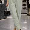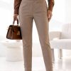 Ez a bézs női nadrág tökéletes választás, ha a letisztult eleganciát különleges részletekkel szeretnéd ötvözni. A magasított derékrész szépen formálja az alakot, míg az enyhén szűkülő szár nőies és kifinomult megjelenést biztosít. A deréknál kialakított dekoratív pántos részlet és a szárvégen megjelenő díszítő elemek igazán stílusossá teszik ezt a darabot. Ideális választás elegáns hétköznapi szettekhez, irodai megjelenéshez vagy csinos alkalmi összeállításokhoz.