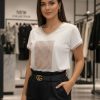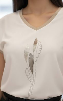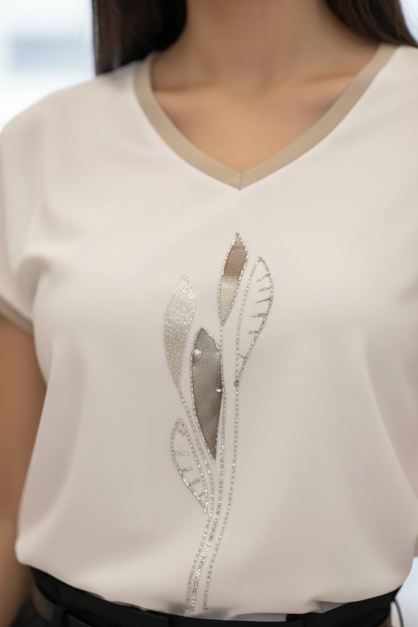 Letisztult, mégis különleges női felső, amely a minimalista megjelenést finom, természet ihlette részletekkel egészíti ki. A törtfehér alapszínt a középen elhelyezett, elegáns levélminta teszi egyedivé, melyet visszafogott arany árnyalatok emelnek ki. A V-nyakkivágás és a diszkréten díszített szegélyek nőies, kifinomult megjelenést biztosítanak.
