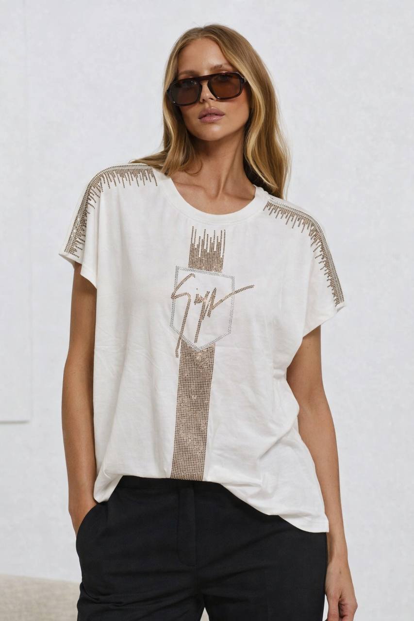 Ez a fehér női felső tökéletes választás, ha szereted a letisztult alapdarabokat különleges részletekkel. A laza szabás kényelmes viseletet biztosít, míg az elején és a vállrészen futó csillogó strasszos díszítés igazán feltűnő, nőies megjelenést ad. A modern mintázat és a finom fényű részletek elegáns karaktert kölcsönöznek a darabnak, így hétköznapi és csinosabb összeállításokhoz is remek választás.