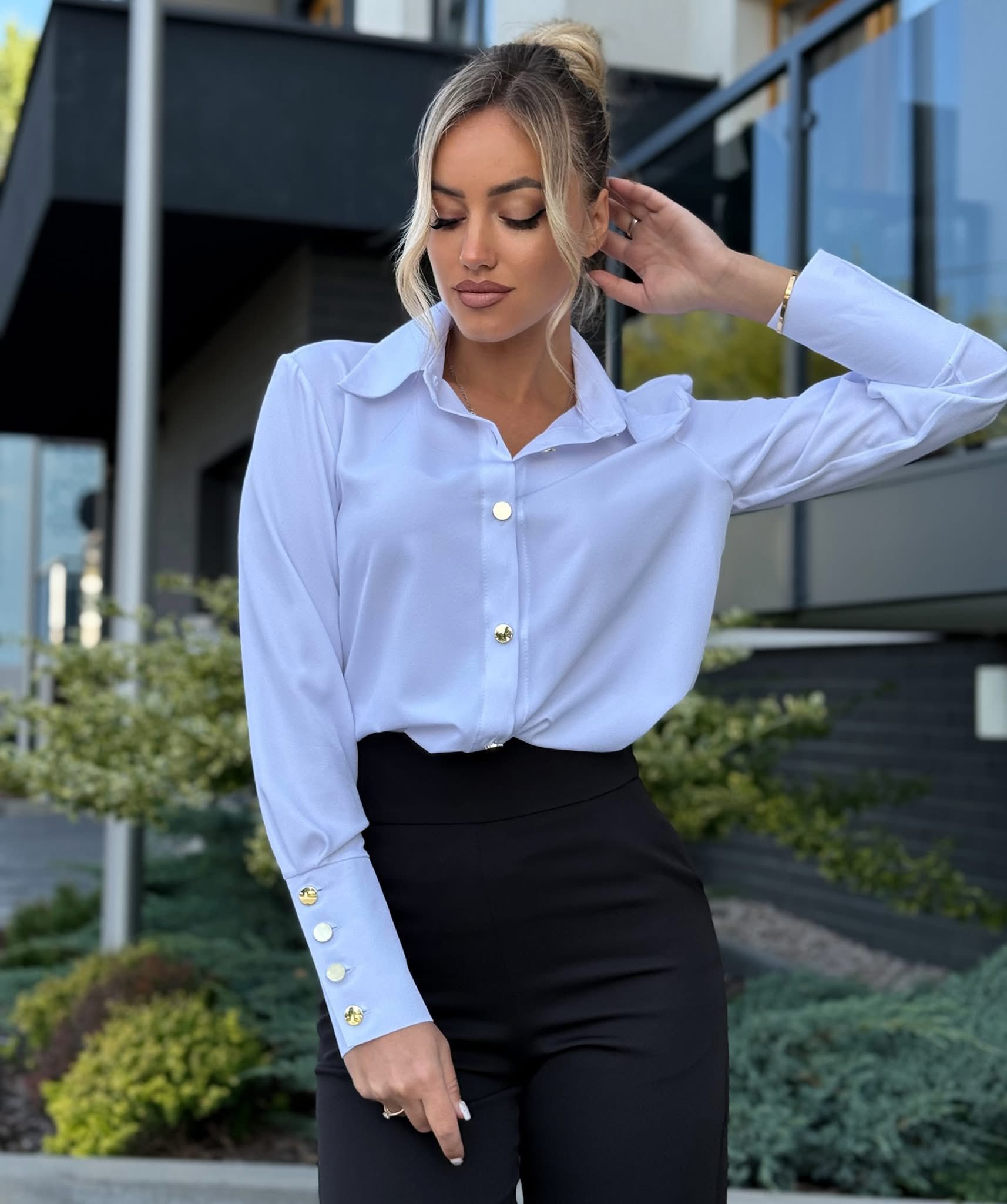 Letisztult stílus és nőies elegancia egy időtlen darabban. Ez a fehér ing klasszikus galléros kialakításával és finoman karcsúsított szabásával tökéletes választás irodai megjelenéshez vagy alkalmi összeállításokhoz. A mandzsettán elhelyezett arany gombok különleges, exkluzív hatást kölcsönöznek az összképnek.