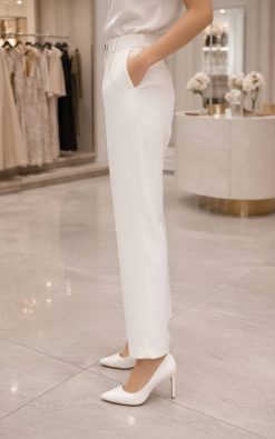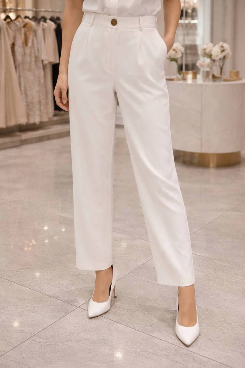 Kifinomult, elegáns női nadrág, amely a minimalista megjelenést modern szabással ötvözi. A letisztult, törtfehér szín és az egyenes szárú fazon klasszikus, mégis friss megjelenést biztosít. A magasított derékrész és a hangsúlyos gomb elegáns részletként emeli ki a darabot, míg a finoman vasalt élek tovább fokozzák a rendezett, nőies összhatást.