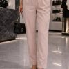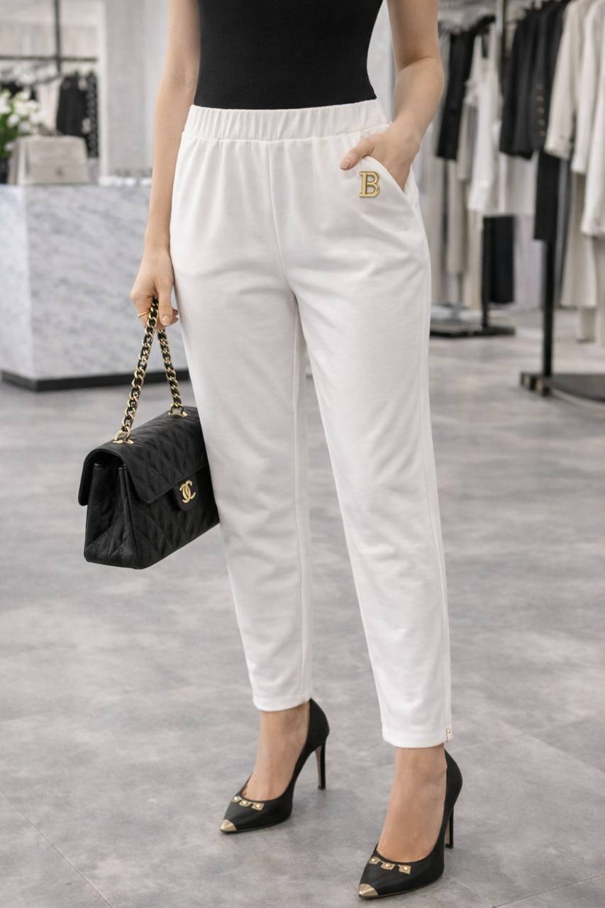 Ez a fehér női nadrág tökéletes választás, ha a kényelmet elegáns megjelenéssel szeretnéd ötvözni. A rugalmas, gumis derékrész egész napos komfortot biztosít, míg az enyhén szűkülő szabás nőies és letisztult hatást kelt. Az oldalzsebek praktikusak, a finom arany díszítés pedig különleges, stílusos részletet ad a darabnak. Remek választás hétköznapi elegáns és alkalmi szettekhez is.