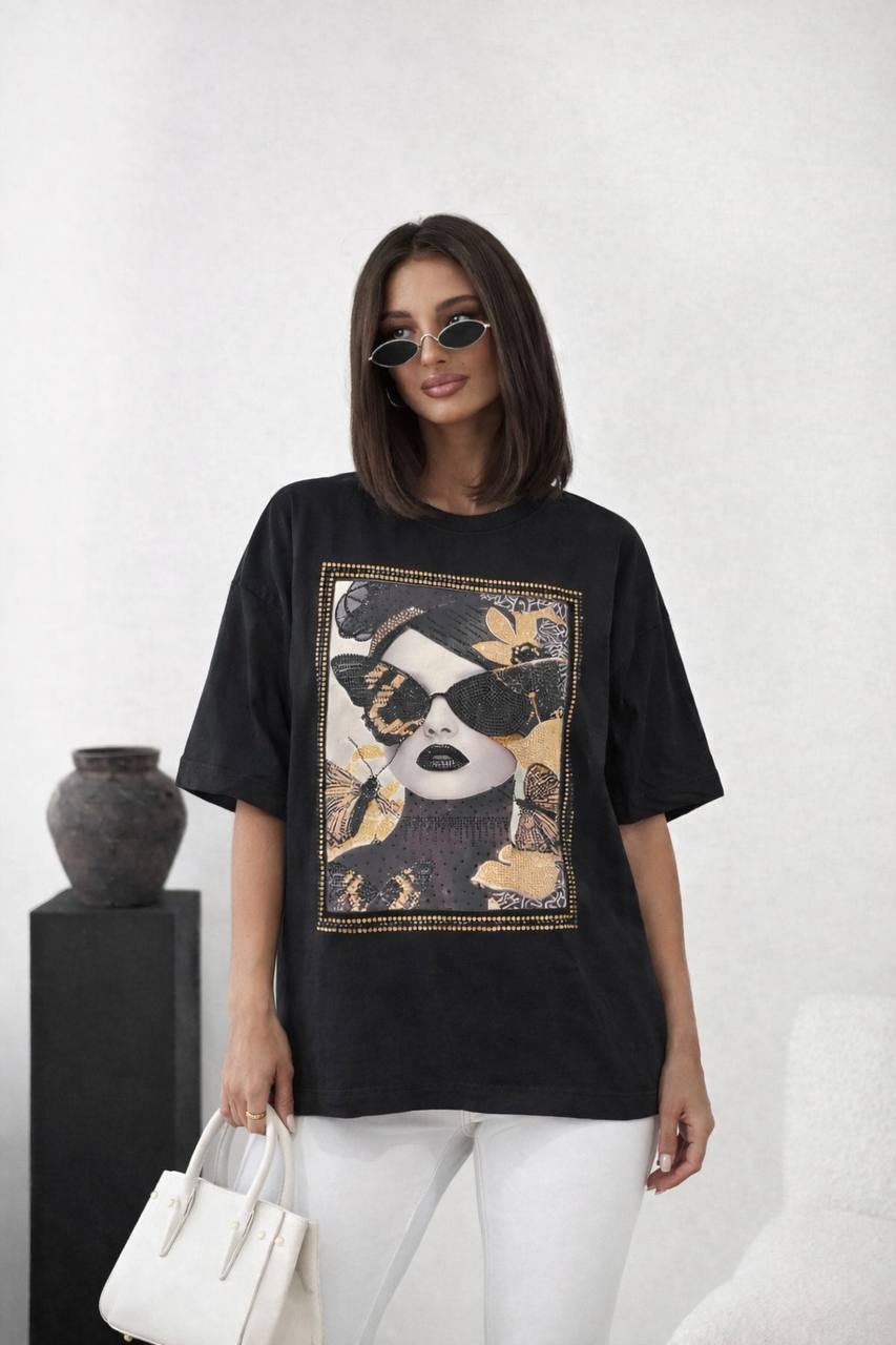 Ez a fekete női póló tökéletes választás, ha szereted a karakteres, figyelemfelkeltő darabokat. Az oversize szabás kényelmes és trendi megjelenést biztosít, míg az elején található látványos női portré, pillangó motívumok és aranyhatású részletek igazán különlegessé teszik. Modern, vagány stílusának köszönhetően farmerrel, bőrnadrággal vagy elegánsabb alsóval is remekül kombinálható.