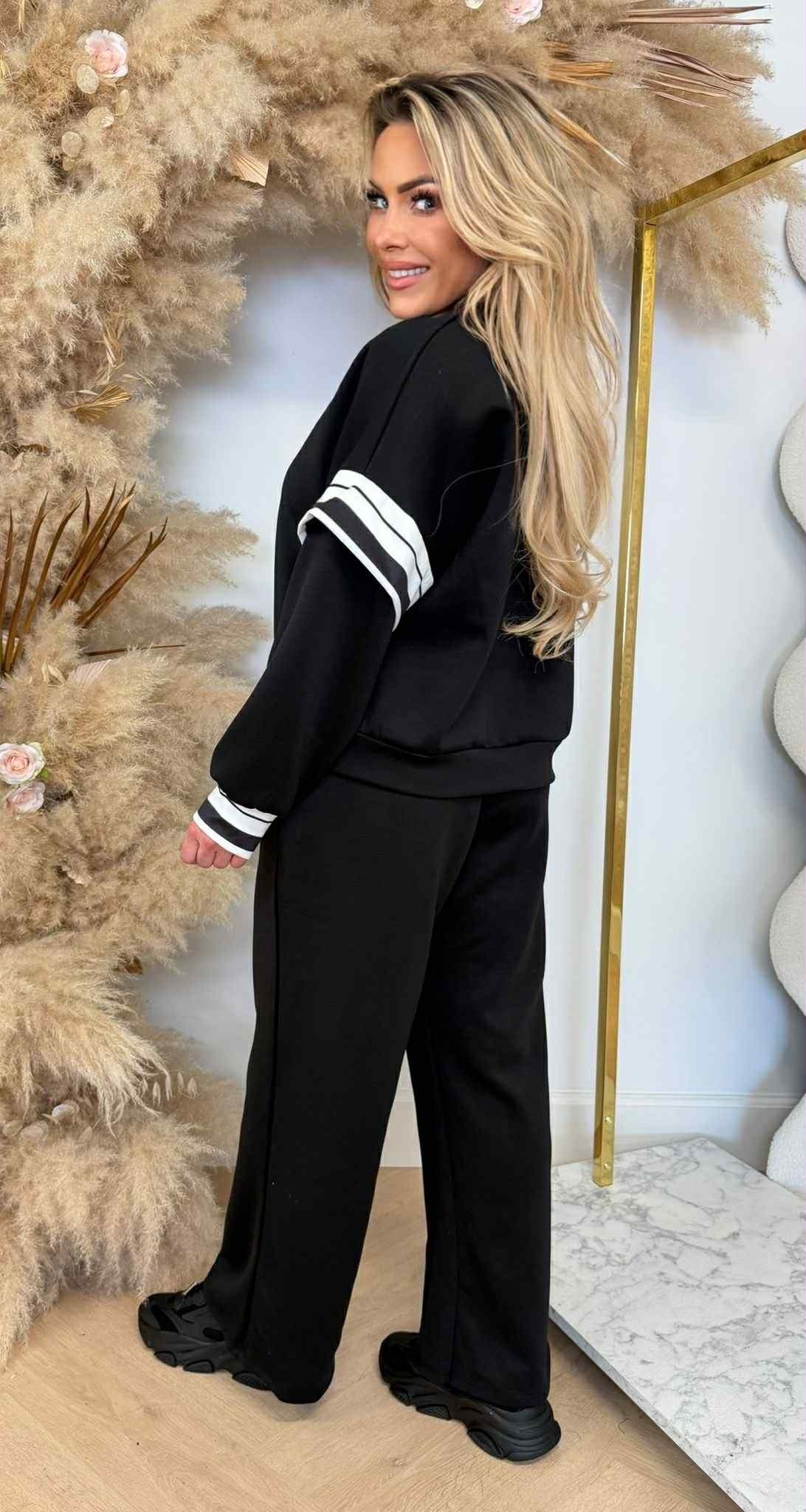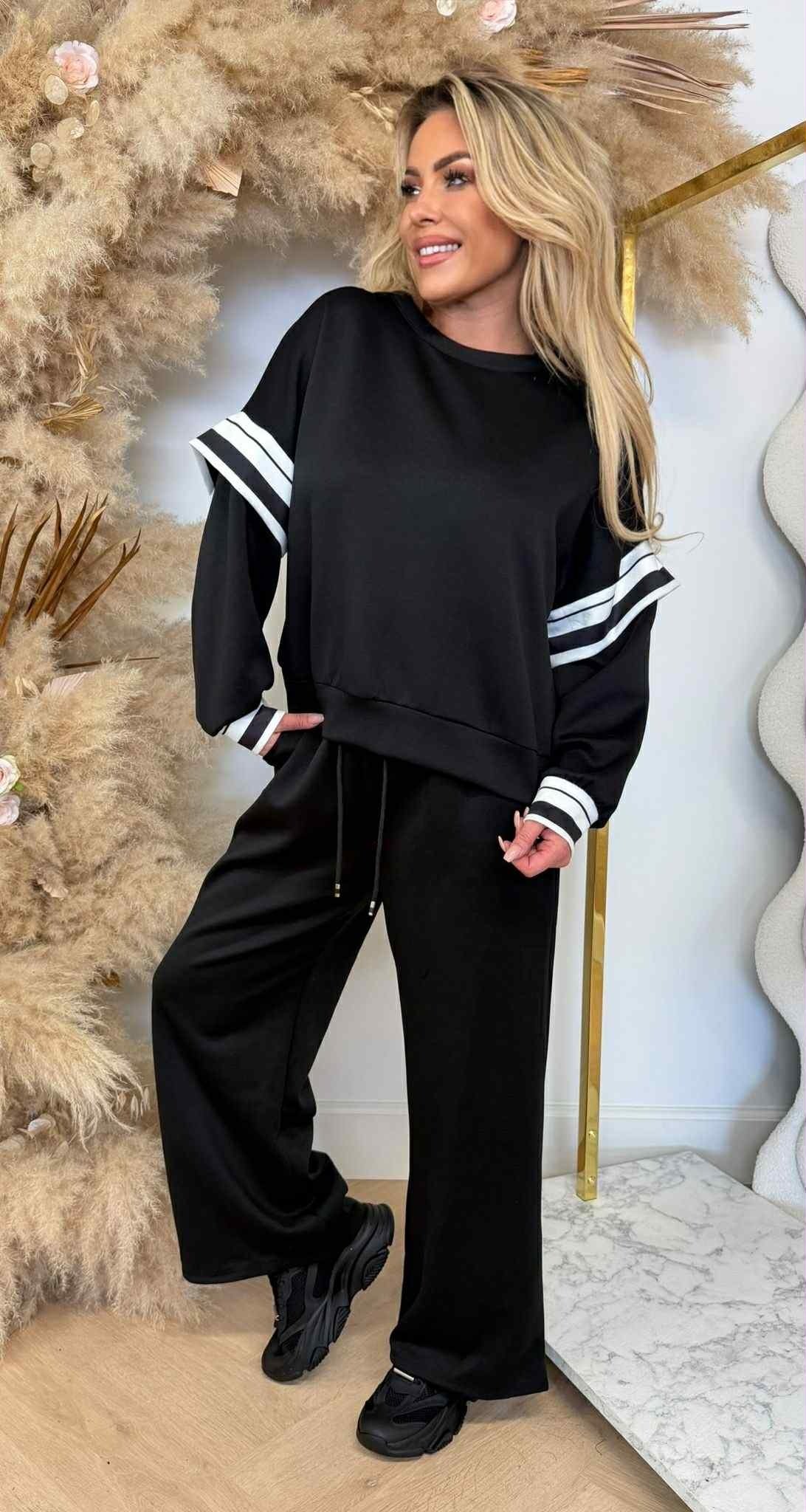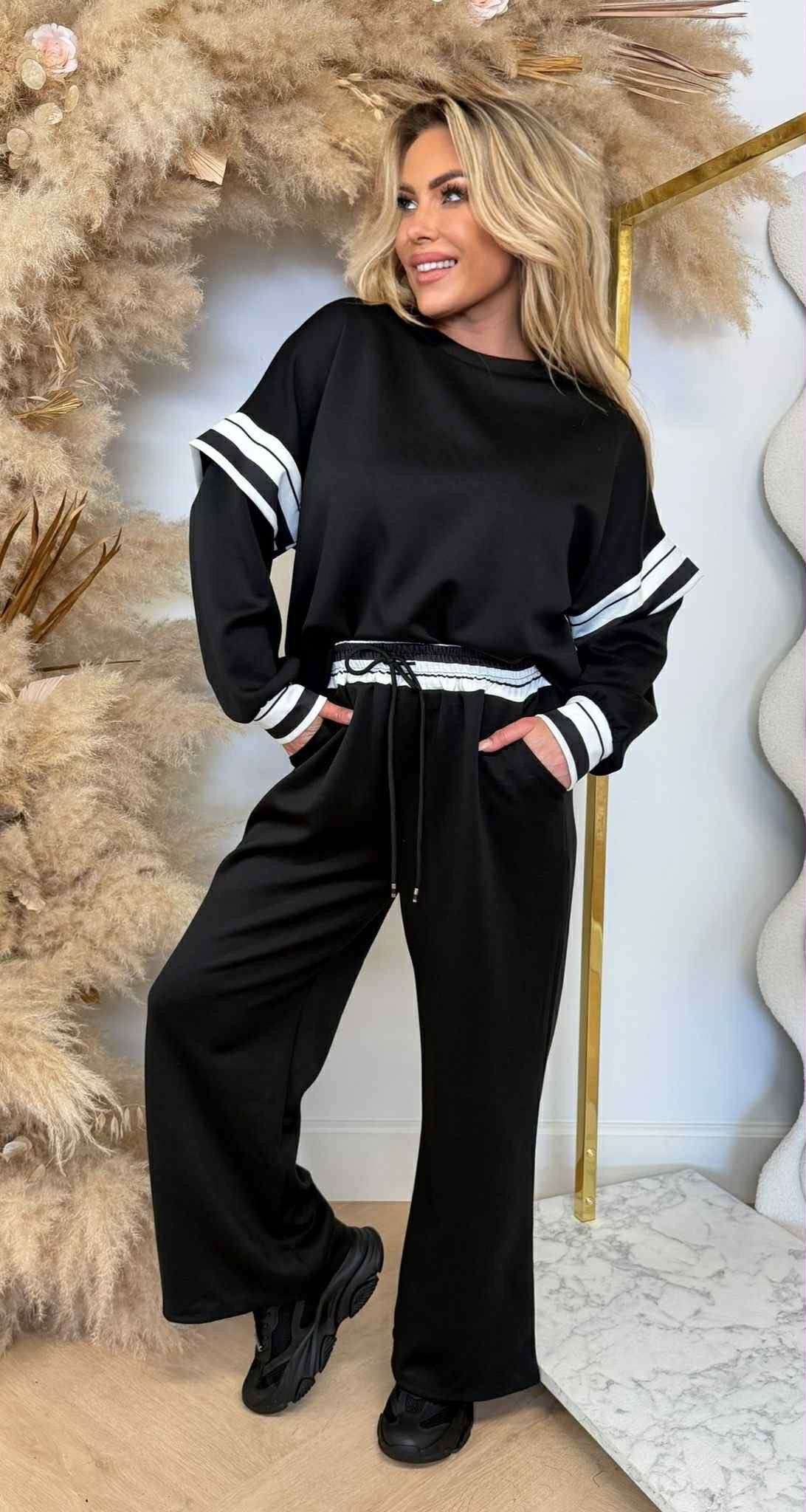 Kényelmes, mégis trendi választás a mindennapokra. A hosszú ujjú felsőt kontrasztos csíkdíszítés teszi különlegessé az ujjakon és a derékrészen, míg a laza szabás modern, lezser hatást kelt. A magas derekú, bő szárú nadrág gumírozott, megkötős kialakítással készült, amely tökéletes illeszkedést és maximális komfortot biztosít.