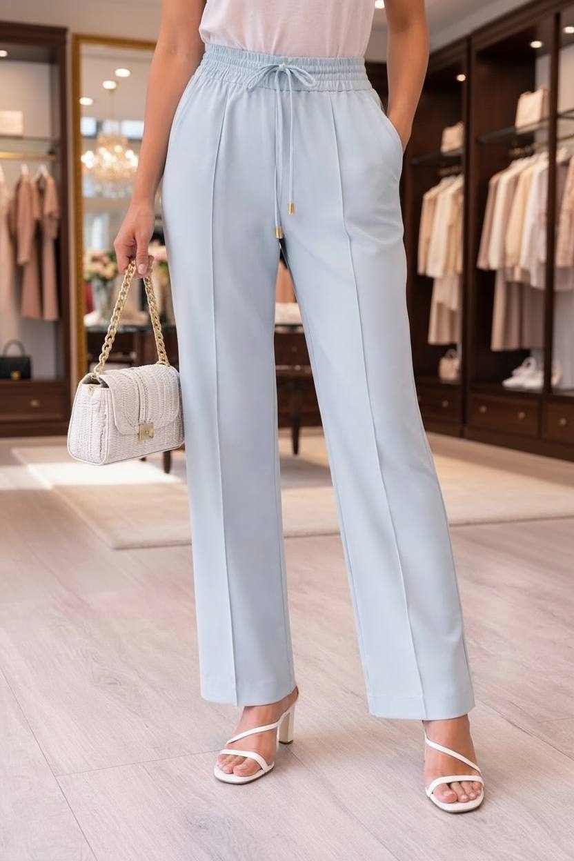 Letisztult, világoskék női nadrág, amely a kényelmet és az eleganciát ötvözi. A magasított, gumírozott derékrész megkötővel biztosítja a tökéletes illeszkedést, míg az egyenes szár és a finom vasalt élek nyújtják az alakot és rendezett megjelenést adnak.
