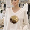 Stílusos, bézs színű női póló, amely kényelmes szabásával és különleges mintájával igazán mutatós választás a mindennapokra. A V-kivágás nőies megjelenést ad, míg a laza fazon kényelmes viseletet biztosít egész nap. Az elején található dekoratív, hullámos mintázat és fa motívum modern, egyedi karaktert kölcsönöz a darabnak. Tökéletes farmerrel, szoknyával vagy rövidnadrággal is.