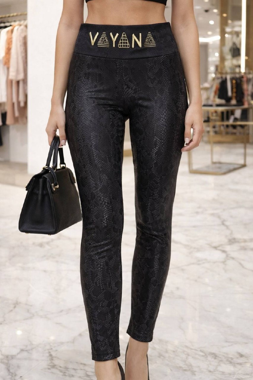 Ez a különleges barna női nadrág a modern elegancia és a feltűnő stílus tökéletes ötvözete. Finom, kígyóbőr hatású mintázata egyedi karaktert kölcsönöz, míg a magas derekú kialakítás szépen kiemeli az alakot. A derékrészen elhelyezett arany színű „VOYANA” felirat exkluzív és divatos részletként teszi igazán különlegessé. Rugalmas anyagának köszönhetően kényelmes viselet, akár egész nap.