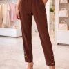 Stílusos, magas derekú női nadrág, amely a klasszikus szabásvonalakat modern részletekkel ötvözi. A karcsúsított fazon és a strukturált anyag kiemeli az alakot, míg az arany gombos díszítés elegáns, luxus hatást kölcsönöz.