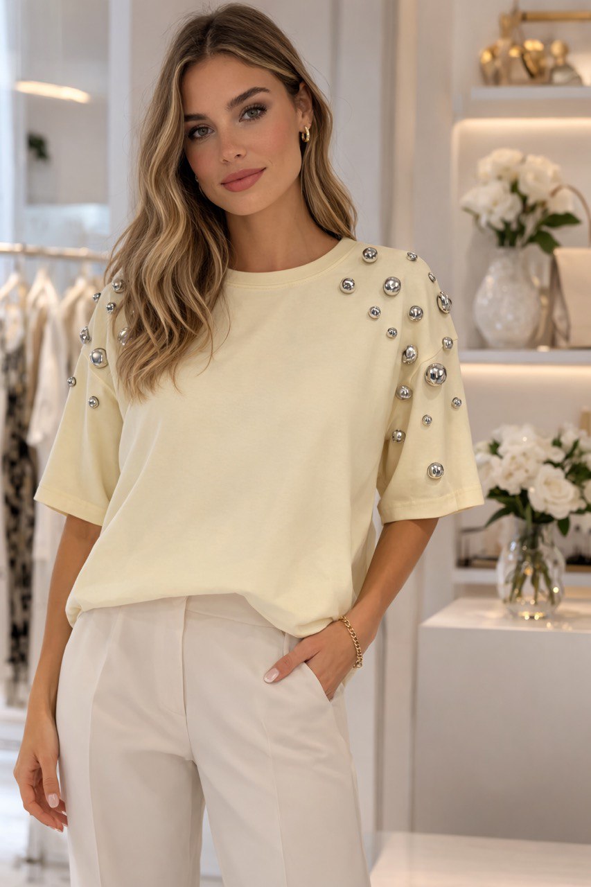 Vidám, pasztell sárga árnyalatú női felső, amelyet különleges, fényes gyöngy díszítés tesz igazán egyedivé. A vállrészen és az ujjakon elhelyezett dekoráció modern, mégis elegáns hatást kelt, miközben a laza szabás kényelmes viseletet biztosít a mindennapok során.