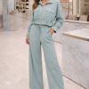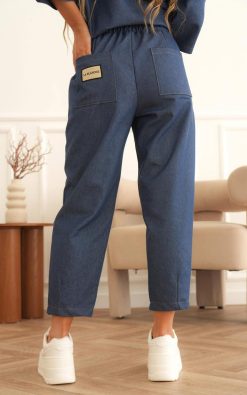 Divatos, farmerhatású kék női szett, amely a lezser stílust és a praktikus kényelmet ötvözi. A szett két különálló darabból áll: egy könnyed szabású, gombos ingből és egy magas derekú nadrágból, így együtt és külön-külön is jól kombinálható.